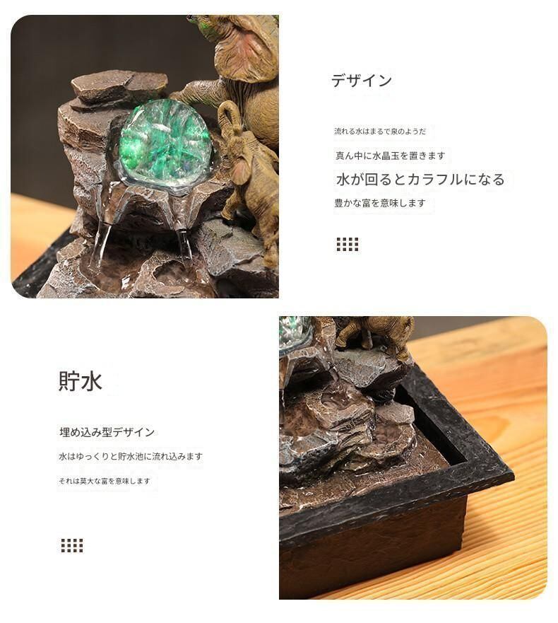 また、中央にはクリスタルボールが配置されており、LEDライトで幻想的な光を放ち、昼夜を問わず美しい雰囲気を作り出します。USB電源で簡単に接続できるため、場所を選ばず使用可能。風水においても「水の流れる置物」は財運や金運を引き寄せる象徴とされ、このアイテムを置くことで、運気アップを期待できます。