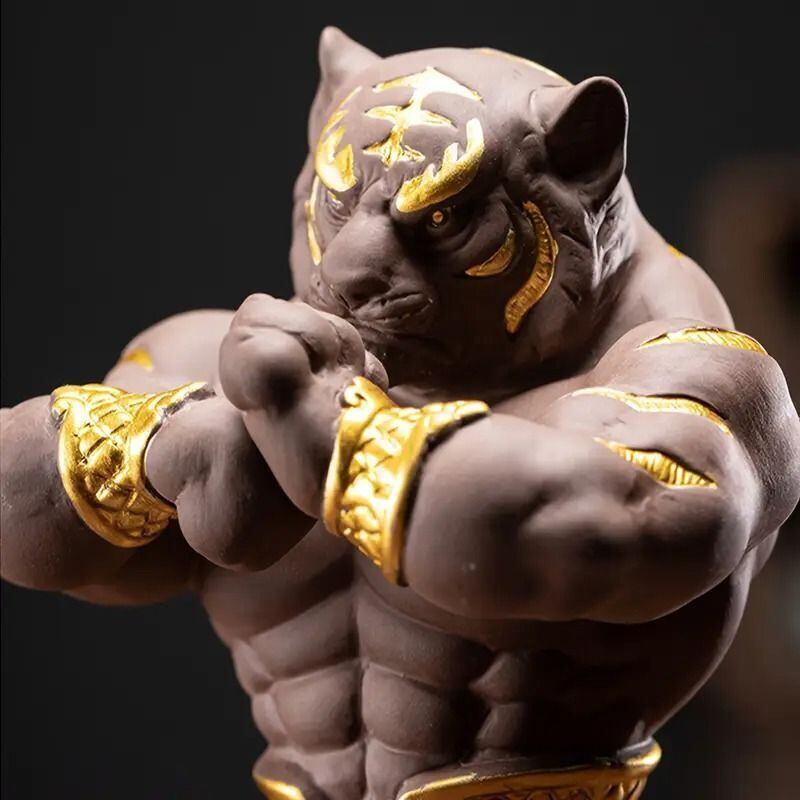 この「タイガーの置物」は、力強く迫力あるデザインが特徴のアイテムです。筋肉質でマッチョな姿の虎が、あなたの空間にダイナミックな印象を与えます。パープルカラーの独特な色合いは、シンプルながらも存在感を放ち、インテリアのアクセントに最適です。