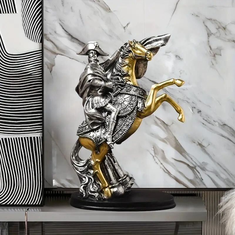 こちらの「ナポレオンの騎馬像」は、歴史的な魅力を感じさせる美しい装飾品です。中世ヨーロッパの騎士や王族を彷彿とさせるデザインで、豪華で洗練された印象を与えます。細部まで精緻に作り込まれた鎧や甲冑、騎馬のディテールが、まるで歴史の中から飛び出してきたかのようなリアルさを誇ります。