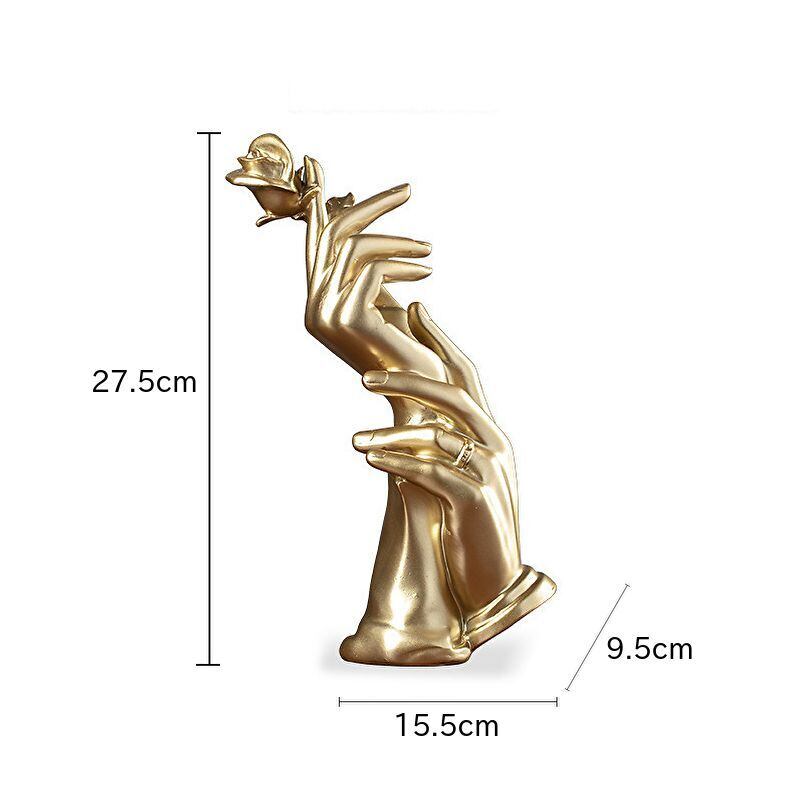 この美しい置物は、エレガントで洗練されたデザインが特徴です。ゴールドの手が優雅に薔薇(バラ)を抱え込む姿は、まるで芸術作品のような存在感を放ちます。手のひらに咲くローズは、しなやかな曲線で繊細に表現され、華やかさと落ち着きのある雰囲気を演出します。高級感あふれるゴールドカラーは、どんな空間にも上品でスタイリッシュなアクセントを加え、見る者を魅了します。