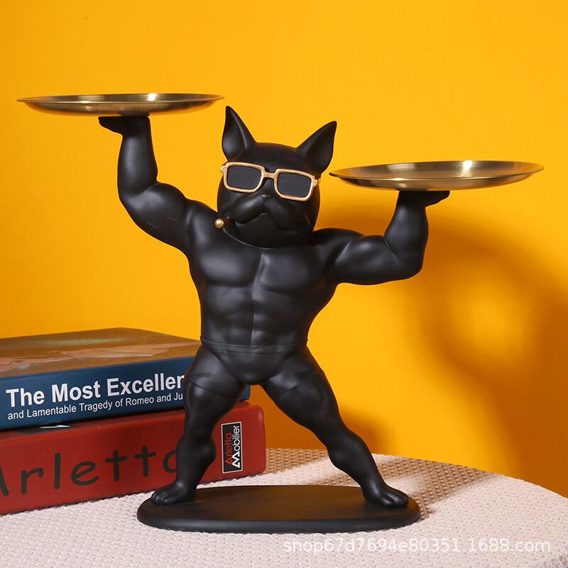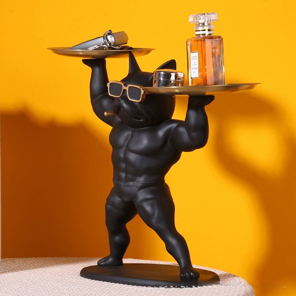 インテリアをおしゃれに演出してくれる、ブルドッグの玄関トレイが新登場!ゴールドとブラックの配色がモダンな雰囲気を醸し出し、お部屋の印象をグッと引き立ててくれます。ユニークなデザインのブルドッグが持つ皿は、小物やアクセサリーの収納にもぴったり。さりげなく鍵やコインを置いておける便利なトレイとしても活躍します。お部屋のアクセントにおしゃれな置物をお探しの方には、ぜひおすすめしたい逸品です。