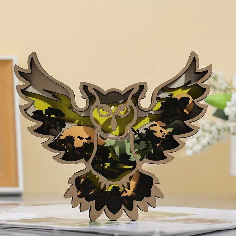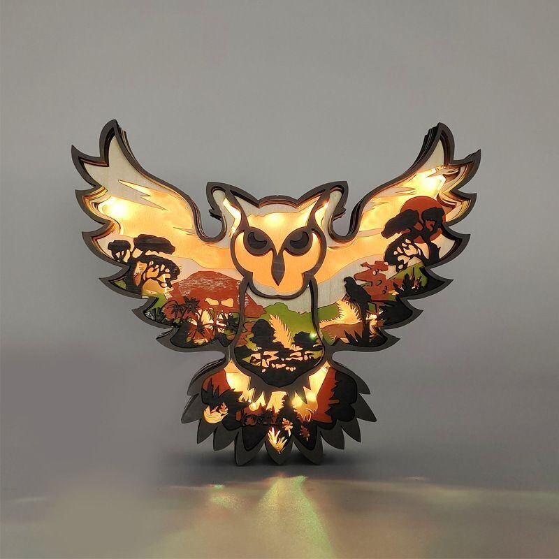 木彫りの可愛らしいフクロウの置物が登場しました。繊細な彫刻技術で表現されたフクロウの姿は、まるで本物のようでありながらも、モダンでアートな雰囲気も漂わせています。さらに、お部屋の雰囲気を引き立てるために、置物には優しい光を灯すライトも付属しています。
