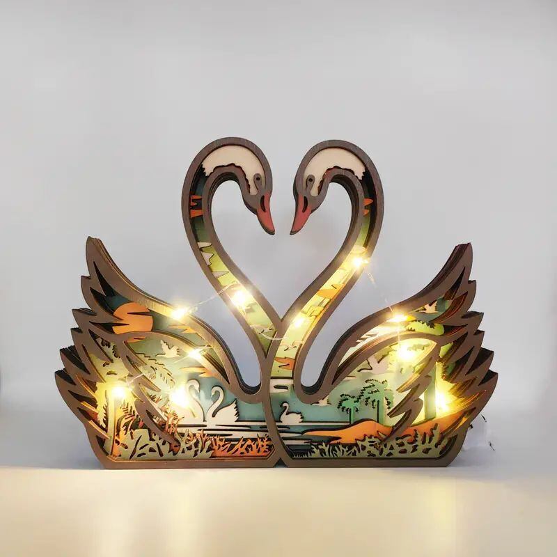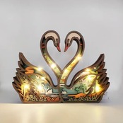 ライトアップで輝く白鳥の置物、それがこのオブジェです。木彫りの美しいデザインは、どんなインテリアにも調和し、お部屋を優雅な雰囲気に包み込んでくれます。リビングルームや玄関、寝室など、どこに飾っても存在感があり、周囲を華やかに演出してくれます。