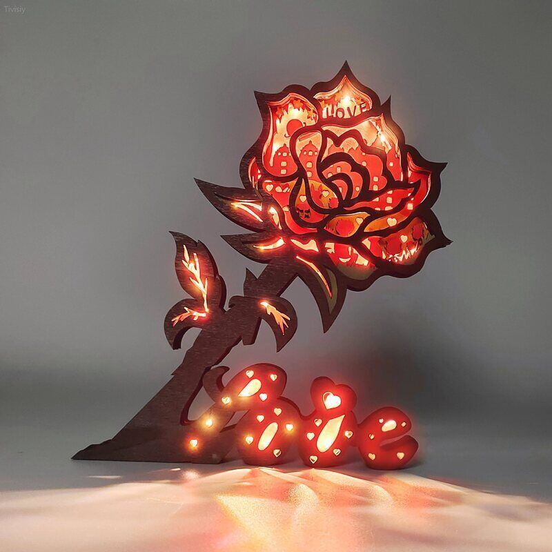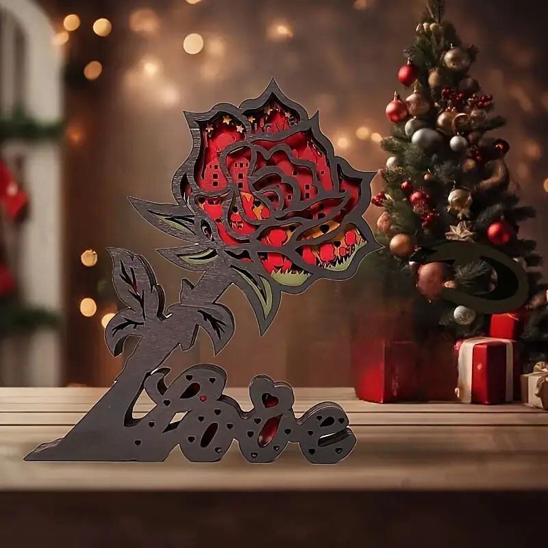 美しい木彫りのバラがLEDライトで照らされる、おしゃれな置物です。リビングルームや寝室、オフィスなど、さまざまな場所に飾っていただけるモダンなデザインが特徴です。このアート作品は、贈り物としても最適です。木の温かみとLEDライトの柔らかな光が、空間に華やかさをもたらします。