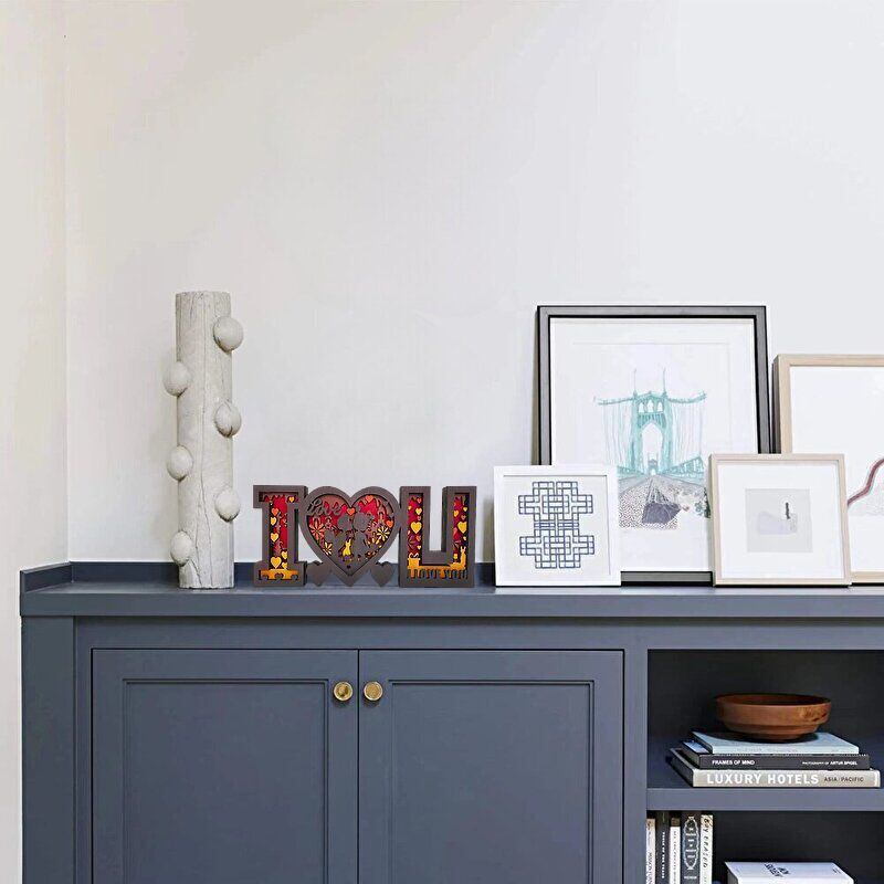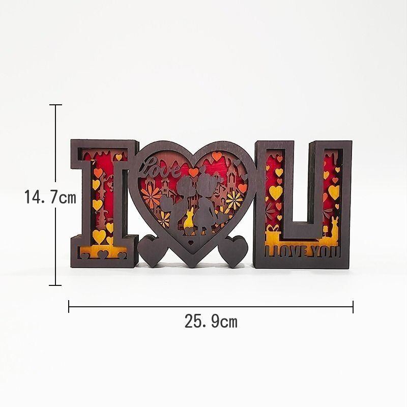 木彫りのI♡Uの文字が、暖かい光で照らされるおしゃれなLED置物です。リビングルーム、寝室、オフィスなどどんな場所にもぴったりなアートアイテム。シンプルでモダンなデザインは、お部屋の雰囲気を一層引き立ててくれます。大切な人へのプレゼントや自分へのご褒美にも最適です。