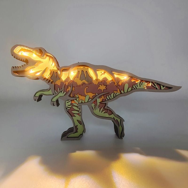 迫力満点のティラノサウルスのオブジェ。木製の繊細な彫刻とLEDライトが融合し、お部屋を美しく照らします。リビングルームや寝室、子供部屋、オフィスなど、どんな空間にもマッチする存在感。かわいらしさとカッコよさが共存する、贈り物にも最適なデザインです。