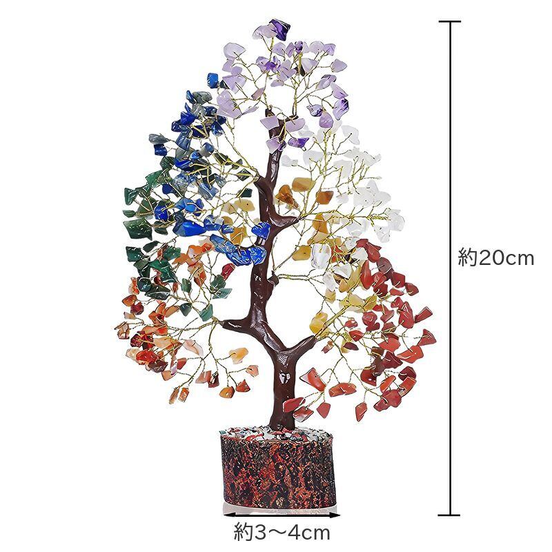 このクリスタルツリーは、レッドジャスパー、アメジスト、ラピスラズリ、カーネリアン、クリアクォーツ、イエローアベンチュリン、グリーンアベンチュリンなどが含まれていて、ポジティブなエネルギーを引き寄せるパワーストーンです。天然石で作られており、開運、繁栄、成功、仕事運、金運、富をもたらすと言われています。リビングルーム、寝室、子供部屋、書斎、廊下など、さまざまな場所に飾ることができ、インテリアとしても素敵なアクセントになります。