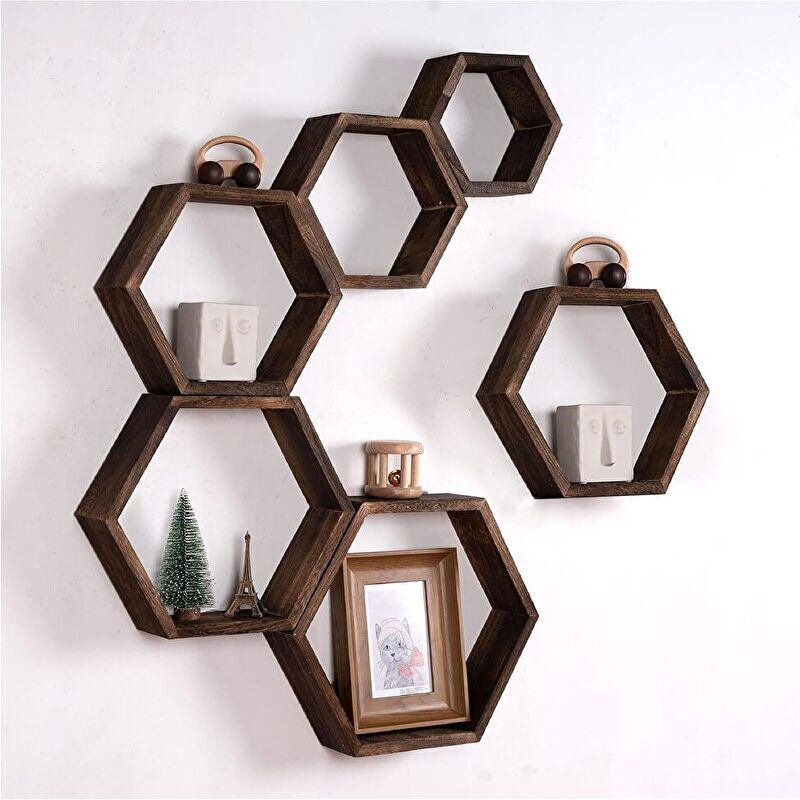 ウォールラック 壁掛け棚 フローティングシェルフ 収納ラック ウォールシェルフ ハニカムシェルフ 整理整頓 六角形 ブラウン 茶色 吊り下げ式 6点セット 木製 無垢材 お洒落 おしゃれ 玄関 リビングルーム ダイニング キッチン 寝室 書斎 廊下 オフィス | Under River/海外輸入インテリア家具.雑貨