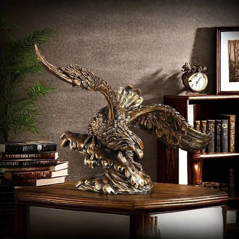 この美しい「イーグルの置物」は、力強さと優雅さを兼ね備えたデザインで、あなたの空間に壮麗な雰囲気をもたらします。精緻に彫刻された鷲(ワシ)の姿は、まるで生きているかのようにダイナミックでありながら、どこか気品を感じさせる美しさを持っています。ブロンズ仕上げの質感が、シックで落ち着いた印象を与え、どんなインテリアにも調和します。